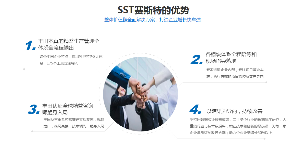 賽斯特集團(tuán)(SST)是豐田為背景的一家致力于企業(yè)管理咨詢(xún)、培訓(xùn)服務(wù)為主的國(guó)際化管理咨詢(xún)機(jī)構(gòu),依托于精益發(fā)源地豐田公司為背景的專(zhuān)家團(tuán)隊(duì),專(zhuān)業(yè)從事精益生產(chǎn)培訓(xùn)和咨詢(xún)服務(wù)的管理咨詢(xún)機(jī)構(gòu),中國(guó)本土唯一一家融合日本豐田,北京現(xiàn)代,韓國(guó)三星等專(zhuān)家為一體的咨詢(xún)機(jī)構(gòu)。旗下?lián)碛校禾旖蛸愃固仄髽I(yè)管理咨詢(xún)公司,天津眾益天成管理咨詢(xún)公司,北京冠群精益管理咨詢(xún)公司,天津精益智能咨詢(xún)有限公司等四家分支機(jī)構(gòu)。 |